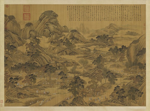 唐岱與沈源,都是十八世紀左右,供奉於清宮內廷的畫家。 「豳」為古代國名。成王即位後,周公攝政,作豳風七月之詩一篇,述后稷公劉政教之始。述其政教之中,則為豳雅,述其政教之成,則為豳頌,以戒成王。畫面上方有張照所抄錄的全篇詩文,圖中情境全是依照詩文內容而加以表達,設色明麗豐富,用筆熟練,是幅詩畫合一的典型宮廷繪畫。