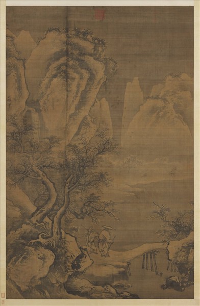 吳偉(西元一四五九-一五○八年),湖北武昌人。字士英,號魯夫,又號小仙。幼年孤貧,流落到江蘇常熟,被進士錢昕所收養,後來漸以善畫而聞名,並為宮廷作畫。擅繪人物、山水。   一片銀白的寒雪,輝映在慘淡的天空。溪旁,一人帶著童子正要過橋,畏寒縮瑟的樣子,描寫得栩栩如生。全幅以大筆揮灑而成,有粗率豪邁的感覺,但筆法的運行卻粗細有致。