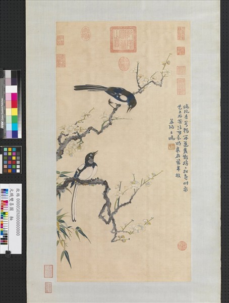 白地設色織。兩隻喜鵲棲於梅花枝上,相互凝望,十分親密。幅右方藍色織詩題:「曉風香萼獨開遲。雙鵲娟娟報喜時;最是上林芳信早,分明春在萬年枝。」織款:華陽王曉。織印一:王曉。 此幅設色清雅,技巧穩健。喜鵲的姿態自然寫實,而彎曲的梅幹和梅花的結組富有生意。