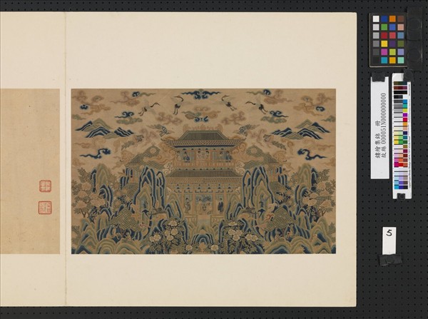 淺褐色地設色織。織仙山樓閣,煙雲縹緲,白鶴彩鳳祥集。界畫精工,織紋緊密,極細微處也能織出,如鳥的飛翔姿態、人物對談的表情都緙織細緻,變化豐富。分色細膩沈靜,構圖對稱而內容圖案化,極富古拙之生趣。本幅為「鏤繪集錦冊」第五幅。