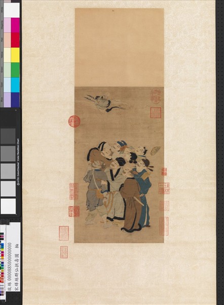 素地設色織。壽星騎鶴從天而來,八仙拱手翹首觀望。畫面很小,但織工相當精細。以緙絲人物來說,構圖愈小愈難製作,但此幅卻不受這樣的限制,雖然人物全擠在小小的空間,但不管是動作、神態都十分寫實,尤其以八仙的臉部表情最為生動,將八仙不同的特色表露無遺,尤其鬚眉等處都用針法勾線,更增添幾分自然活潑的面貌。
