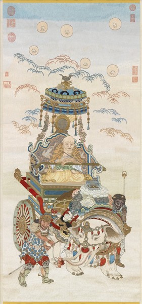 滿繡填地五彩線繡。文殊菩薩駕獅圖。無款印。本圖中駕象者,為一羅漢形相。唯據經典紀錄,駕象隨侍釋尊右側者,應為普賢菩薩。又根據「法華經」所載,普賢菩薩曾發願後世有修習該經者,「我當乘六牙白象與無量菩薩而自圍繞,以一切重生所喜見身,現其人前,而為說法」據此,本幅刺繡中化現為羅漢法相者,應是普賢。是幅與釋迦牟尼佛、文殊菩薩圖、及本院所藏其他十大明王圖像,共計十三件合稱清繡線佛像十三軸。每幅繡像構圖嚴謹,配色明麗,繡種多樣,工整精美,觀其繡風應當是乾隆時代宮廷刺繡,件件皆精品。