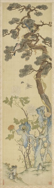牡丹倚奇石盛開,雙蝶飛舞花間,雙鳥棲於柏枝上,是幅為花鳥宮屏軸之二,故形式、構圖、設色均與前幅相同,僅圖案略有差異。