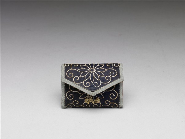 清自建國以來一直十分強調滿人的傳統,這件火鐮荷包,作三折式,中間一折附夾層,一端收尖內附銀鈎,一端附方形如意紋摺頁,面上縫花形扣,收折後可扣合,內層有二夾層袋,內置火石及艾絨。荷包內存放的火鐮為鋼製長方圓形環,環上鑲帶狀銅鎏金鏤空花卉,與常見鐮刀背形狀(或說月牙形、斧形)者不相同,火石二片,呈不規則形,邊緣銳利,質地堅硬略透明,主要成分為石英(二氧化硅),取自堅硬的山石或河石。荷包以皮為內墊,深藍絲布為面,邊緣鑲灰藍色錦布,沿布邊內側釘銀線,面上特別以鹿尾細毛為繡線,並用遼金等游牧民族常用的釘繡技法,作花卉捲枝紋飾,花卉紋樣和火鐮上樣式相呼應,內層襯著染成紅色的細麻布,無論作工、繡工均十分精細。荷包內層留下火鐮形的印記和燒漬痕,火鐮的相應位置上也沾黏著布痕,可見此火鐮和荷包是帝王平日實際使用的用品。 根據木盒題識(並見於《御製詩二集》卷4),由於高宗從《清文鑑》中得知滿人以鹿尾絨毛為線的舊俗,乾隆十二年(1747)木蘭秋獼時和孝賢純皇后富察氏(1712-1748)提及此事,皇后特別親手縫製這件道地的滿人風格樣式的火鐮荷包呈進。戊辰年(乾隆十三年,1748)高宗看著這件荷包,憶及甫過世的皇后,百感交集,遂製木盒盛裝火鐮荷包,並撰詩文以誌。高宗孝賢純皇后於雍正五年(1730)冊封為寶親王弘曆的嫡福晉,乾隆二年(1737)冊封為后,出身滿洲鑲黃旗人,身世顯赫,夫妻二人感情深厚,這件荷包除了顯示皇后的賢淑,詩文中提到「練裙繒服曾聞古,土壁葛燈莫忘前,共我同心思示儉,即兹知要允稱賢。」更可讀出清代皇室對於滿人儉樸德性傳統的重視,並且時時相互提醒,在乾隆宮廷的藝術品味中,滿人的種種特質一直是一項不可被忘卻的重點。