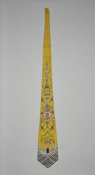 綵帨是繫於胸前,上窄下寬而銳的綢帶,造形類似現在的領帶,只是長可過膝,上端有掛環,可固定在朝褂的鈕扣上,環上佩箴、管、縏、袠等墜角的絲縧。皇后、皇貴妃朝服的綵帨為綠色,繡五穀豐登,佩箴、管等,明黃縧。貴妃用縧為金黃色,妃繡文為靈芝瑞草,餘同貴妃。嬪不繡文。此件為緙絲五穀豐登。滿人婦女習俗佩巾,除了冠服禮制時規範佩戴的樣式之外,如此作工講究的綵帨,穿著吉服及常服時也可以佩戴,作為裝飾。