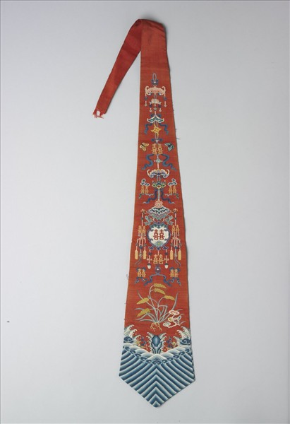綵帨是繫於胸前,上窄下寬而銳的綢帶,造形類似現在的領帶,只是長可過膝,上端有掛環,可固定在朝褂的鈕扣上,環上佩箴、管、縏、袠等墜角的絲縧。皇后、皇貴妃朝服的綵帨為綠色,繡五穀豐登,佩箴、管等,明黃縧。貴妃用縧為金黃色,妃繡文為靈芝瑞草,餘同貴妃。嬪不繡文。此件為緙絲五穀豐登。滿人婦女習俗佩巾,除了冠服禮制時規範佩戴的樣式之外,如此作工講究的綵帨,穿著吉服及常服時也可以佩戴,作為裝飾。