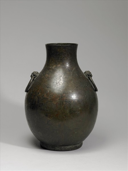 口微侈,束頸,鼓腹,圈足。肩部兩側為鋪首銜環,環上飾流雲紋。器身嵌以紅銅裝飾,自口沿至腹底計有七層圖案,分別以對頂三角紋為界,佈列成格狀。紋飾由上至下為鳳鳥紋兩層、獨角龍紋四層,最下層為寫實鹿紋。器身兩面正中處飾大獸面。器外底有溢銅,貼有清宮黃籤「重八十八号」。形制與河南淅川和尚嶺出土畫像銅壺(HXHM2:26、27)相似。