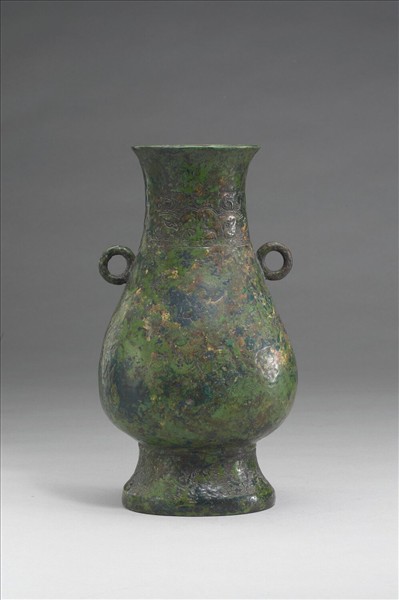 圓瓶,侈口,直頸,環耳,鼓腹,圈足。頸飾獸面紋,以雷紋為地,耳飾綯紋,足飾波浪紋。
