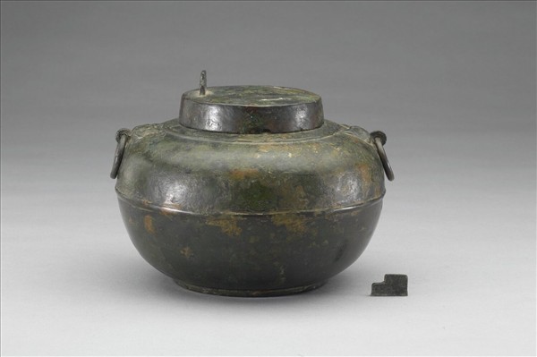 缶,附蓋、直口、獸首銜環耳、鼓腹、圈足,蓋有片狀耳,一缺一殘脫。肩、腹飾弦紋。