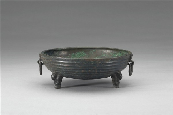 圓口,鋪首銜環耳,三足。腹飾瓦紋,足為立姿獸形。