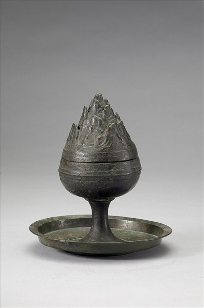器呈豆形,蓋為鏤空的起伏山巒狀。山巒間飾有仙人及異獸。底有承盤。