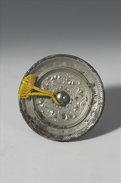 圓形鏡,半球鈕。花瓣形鈕座配以座外細密的花蕊,宛如綻放的花朵。鏡背紋飾以高起的弦紋分為內外兩區。內區為連綿的花朵,每組由三個浮雕花瓣構成。外區飾楷書銘文一周:「賞得秦王鏡,判不惜千金。非關欲照膽,特是自明心。」全器銀白皎潔,鑄作精美,流麗的花紋充滿動感。
