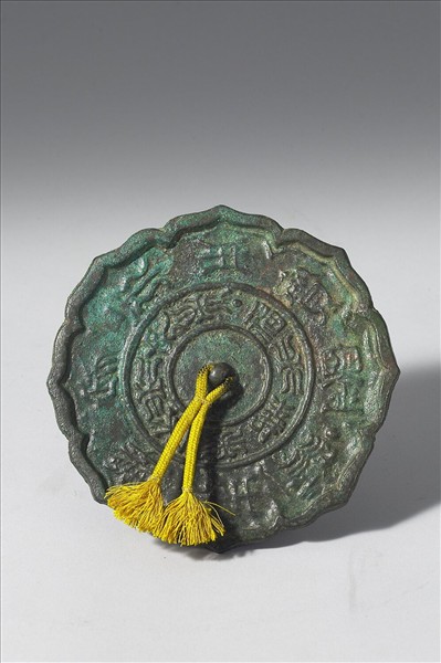 八瓣菱花形鏡,半球鈕。鏡背紋飾為雙圈銘文。內圈銘文為「福壽家安」,每字間夾一壽字紋。外圈銘文八字:「清素傳家,永用寶鍳。」相同的鏡子曾出土於河南遂平縣一座北宋末年墓葬。院藏(傳)元人〈梅花仕女〉中,美人手持鏡式與此鏡十分相似。