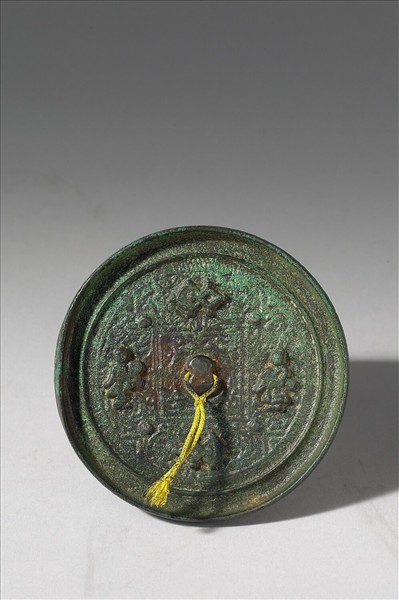 圓形鏡,鈕呈銀錠形。鏡緣高聳細窄。鏡背紋飾呈漢代博局紋鏡格局。鏡鈕環以柿蒂紋鈕座,外有雙線方欄,欄外四角各有一乳丁及V 形紋。鏡鈕左右兩側各有一手持物品的浮雕人物,上下則為圓錢與方勝交疊的浮雕吉祥圖案。