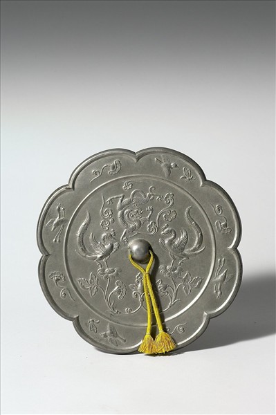 八瓣葵花形鏡,半球鈕。內區浮雕主紋由龍鳳構成。鏡鈕兩側為相對的展翅舞鳳,佇立在連枝蓮花上。鏡鈕上方為騰龍紋,周圍襯以祥雲。每瓣鏡緣內均有浮雕紋飾,如折枝蓮葉、啣綬飛鳥、小鳥逐蝶等。對鳥形式的紋飾佈局已多見於盛唐時期,騰龍紋及葵瓣形鏡則主要流行於唐代中期。