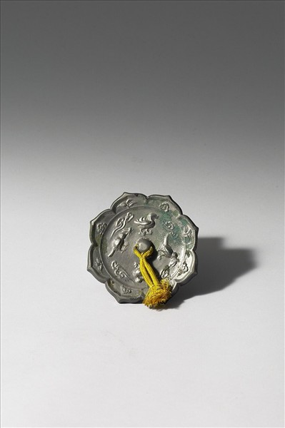 八瓣菱花形鏡,半球鈕。內區飾繞行的水禽及啣花鵲鳥。遊禽間有祥雲。外區略高,飾折枝花及雲朵紋。