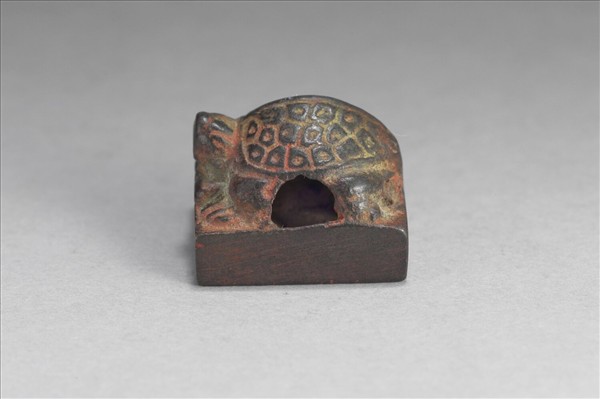 龜鈕,印體中凹而薄,印面「張德」白文二字,無邊,筆畫壯碩深刻。