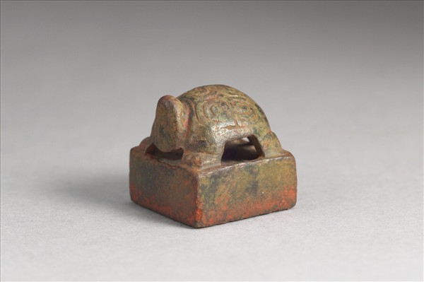 方印,龜鈕,印面鑄朱白(陽陰)相間四字「張宣之印」。「張宣」白文,「之印」朱文。
