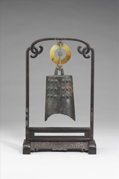 合瓦形,弧形口,兩面各有枚18個。索形紐,鼓部正中飾梯形紋,內填雲紋。此器形制、紋飾與山東長清仙人臺五號墓出土編鐘(M5:60-68)、河南新鄭鄭國祭祀遺址出土編鐘(T595K1:B1-B10)相似。清宮配有玉環木架,架頂有篆書「乾隆御賞」,底有「漢編鐘」銘。
