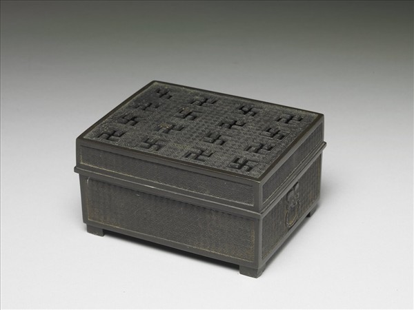 全器飾以回紋,線條勻細,蓋面作卍、卐字形鏤空,銅色蠟茶,器底有篆款:「紹興二年(1132)大寧廠臣蘇漢臣監督姜氏鑄至德壇用」,(明)高濂《遵生八牋》曾提到,當時人喜愛元代杭城姜娘子新鑄的銅器,其特點在於「其撥蠟亦精,其煉銅亦淨,細巧錦地,花紋亦可入目,因其製務法古」,清初王士禎(1634-1711)《居易錄》也曾在孔尚任(1648-1718)的收藏中見過和本展品相同的方爐,因此此類香爐應在十七世紀的江南流傳。