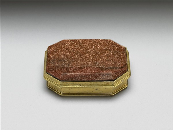 銅質,扁八方形小盒。子母口,淺直壁,蓋緣與足鏨飾斜階式凸棱多道,蓋面嵌八方形金星玻璃石一塊。內收小螺蛤四枚。本件收入乾隆時期製作多寶格「集瓊藻」中,據集瓊藻小冊所載原有二層七十三件,共儲於嵌飾獸骨螺甸的木箱中。