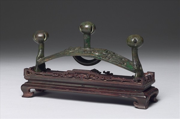 此器著錄於《西清續鑑.甲編》卷17頁44作「漢旂鈴一」。原為商晚期的弓形器,是安置在弓的中央藉以強固弓的一種器具。左右兩側的曲臂斷掉之後,在兩端加鑄器末,並在器的兩端與中央加鈴,器背則加一半環。表面鑄有人形裝飾,原來應鑲嵌著綠松石。