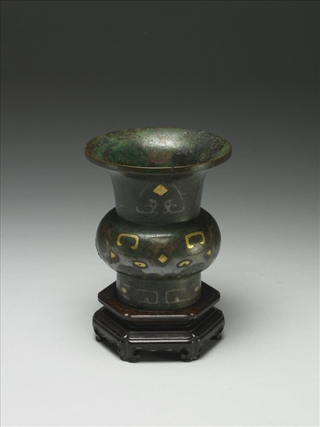 器作尊形,器表錯金銀動物面紋,紋樣結構及器形與商周者類而不同,應是後世仿古之作。附木座,座面刻「乾隆御鑑」篆款填金,底刻「周史尊 甲」楷款填金。