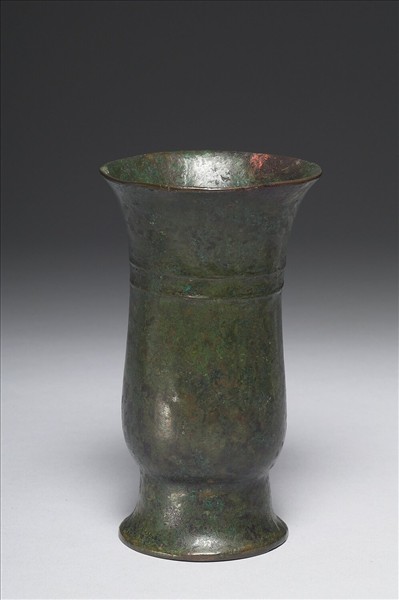 器形橢圓,撇口、束頸、圈足外侈,頸部二弦紋。附木座,座面刻「乾隆御鑑」篆款填金,底刻「周弦紋觶 二 丙」三行楷款填金。