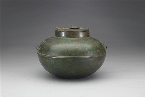 罐,附蓋,直口,小獸首耳,鼓腹,平底,蓋有環耳。腹飾弦紋,蓋面飾一對小獸首。