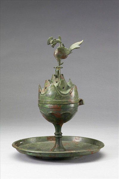 由蓋、身、柄、盤組成。蓋隆作崇山狀,似層巒疊嶂,蓋壁上開孔數處。蓋頂飾立雕鳳鳥,可取下。爐身子母口,圓腹飾蓮瓣紋,下承柱,立于淺盤中央。