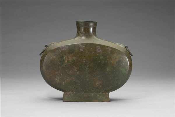 扁壺,腹縱剖面呈橢圓形,圓口、方形圈足,肩飾獸首銜環耳。