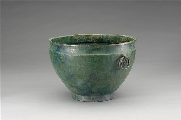 盤口,折肩,圓腹,圈足,兩側有成對鋪首銜環。外底有箅。