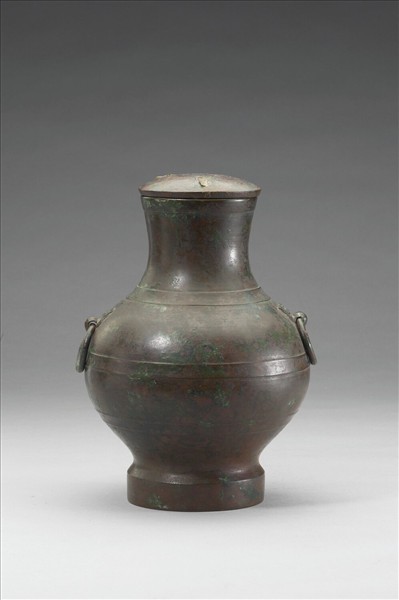 鍾,附平頂蓋、侈口,鋪首銜環耳,鼓腹,高圈足。腹飾弦紋。外底有銘三字。