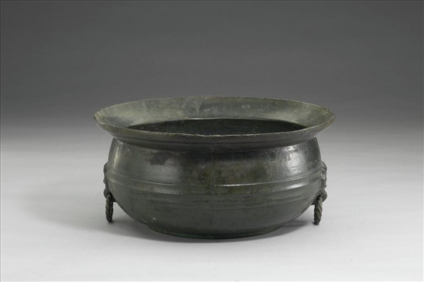 侈口,圓腹,鋪首銜環耳,平底。腹飾帶紋。器底範線明顯。