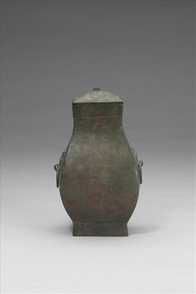 全器作方形附蓋,侈口,縮頸,鋪首銜環耳,鼓腹,高圈足。蓋飾幾何紋。