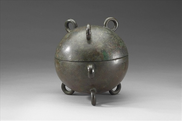 蓋、腹呈球體,環耳,三足。蓋有環耳,可倒置另為容器,足亦為環耳。腹飾獸紋。