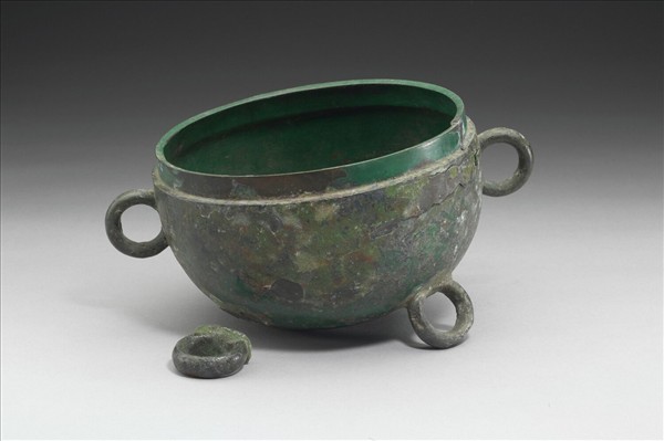 敦,器作半球體,子母口、環耳,並以三環耳為足,一足脫落。