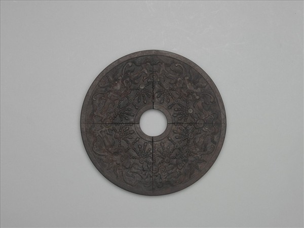 玉璧形木片,中有穿,兩面邊廓皆起棱。一面淺浮雕龍首一圈,龍皆啣纓珞,兩側出趾爪,與鄰龍共抓一火珠;一面裱紙,紙上以畫家嵩山所繪的山水樓觀為飾。由於清代乾隆皇帝對於珍視的古物,常常會用一些特別的製作來加以裝盛、收藏。對於收藏銅鏡,他就在「冊頁」形木方匣內依照銅鏡形狀挖槽收藏,收藏時鏡上先置軟墊,再覆以雕飾精美的木質蓋。而前述的玉璧形木片,即是木質蓋。