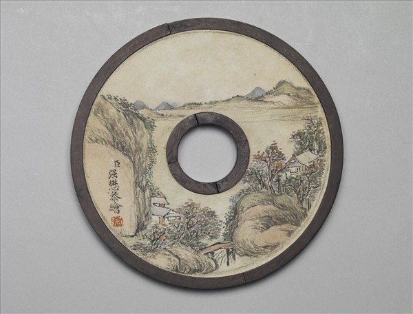 玉璧形木片,中有穿,兩面邊廓皆起棱。一面淺浮雕花葉邊開光,將面上空間分成五等分,開光內填飾卍字錦地;另一面裱紙,紙上為畫家強懋所繪的設色山水屋舍。由於清代乾隆皇帝對於珍視的古物,常常會用一些特別的製作來加以裝盛、收藏。對於收藏銅鏡,他就在「冊頁」形木方匣內依照銅鏡形狀挖槽收藏,收藏時鏡上先置軟墊,再覆以雕飾精美的木質蓋。而前述的玉璧形木片,即是木質蓋。