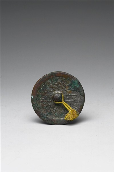圓鏡,圓鈕、圓鈕座,附木托。內區飾雙龍紋,有銘但文字漫渙不清。
