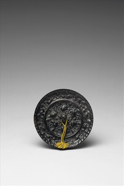 圓鏡,獸鈕,附木托。內區飾海獸葡萄紋,外區飾蟲鳥葡萄紋,鏡緣飾一周雲朵紋。