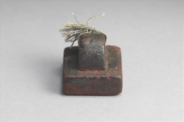 鼻鈕,方面印體中厚,銅中帶紅,印面「軍假司馬」白文四字,無邊。字體筆畫樸實,轉彎處多呈直角。「假司馬」,武官名。據《後漢書.百官志》,將軍皆有部曲,屬官有軍假司馬、假侯,為常置武官。又軍假司馬、假候,皆為副將。