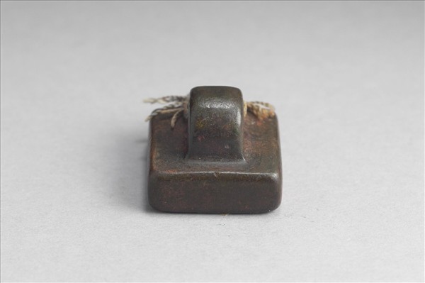 鼻鈕,方面印體中厚,銅中帶紅,印面「軍假司馬」白文四字,無邊。整體筆畫樸實,四邊磨損成圓,刻工仔細。假司馬,武官名。據《後漢書.百官志》,將軍皆有部曲,屬官有軍假司馬、假侯,為常置武官。又軍假司馬、假候,皆為副將。