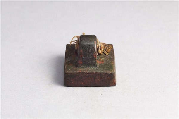 鼻鈕繫繩,方面印體稍薄,銅中帶紅,印面「別部司馬」白文四字,無邊,鈕上穿有繩。整體篆法樸實,轉角處帶圓邊,刻工謹慎。別部司馬為武官名,位階同於「軍司馬」。