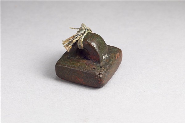 鼻鈕繫繩,方面印體稍薄,銅中帶紅,印面「軍曲侯印」白文四字,無邊。整體篆法工整清秀,筆畫雕琢細緻,四角磨圓。西漢中晚期始有軍侯之印,軍侯,將軍之屬官。