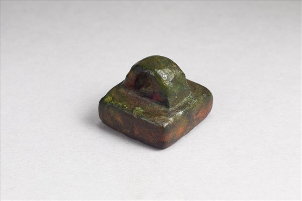 鼻鈕,方面印體中厚,銅中帶紅,印面「軍曲侯印」白文四字,無邊。印文模糊斑駁,筆畫因侵蝕斷續不清,四角磨圓。