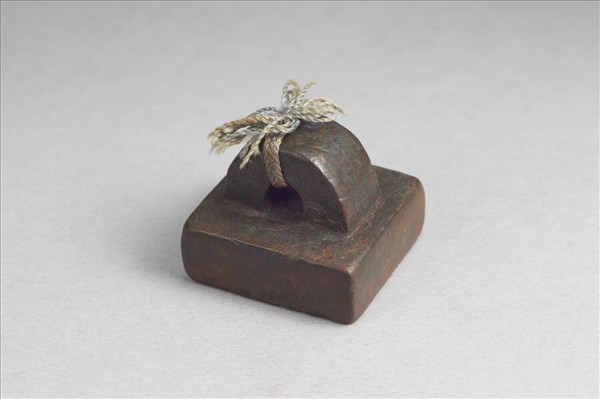 鼻鈕繫繩,方面印體中厚,銅中帶紅,印面「軍曲侯印」白文四字,無邊。整體篆法工整一致,筆畫細緻,結構勻稱。