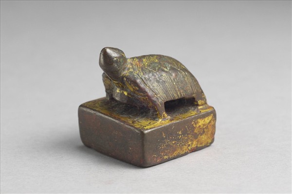 龜鈕,方面印體中厚,表面鎏金,印面「關內侯印」白文四字,無邊。龜鈕精細,龜首上昂,龜殼五角劃花。整體篆法稍凌亂,往外上偏,斑駁。