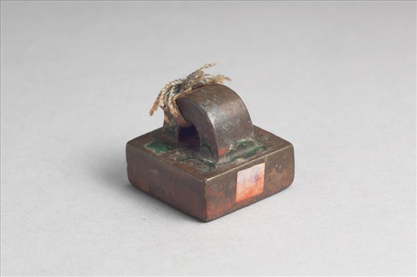 鼻鈕繫繩,方面印體中厚,印面「部曲將印」白文四字,鈕上有繫繩。整體篆法粗壯雄渾,筆畫有樸質之感,空間編排甚佳,結構勻稱。部曲將,漢末至三國時代武官名。