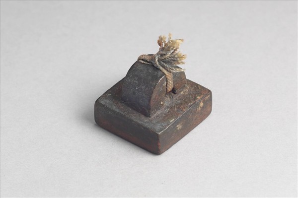鼻鈕繫繩,方面印體中厚,印面「部曲將印」白文四字,鈕上有繫繩,無邊。整體篆法粗壯雄渾,筆畫有樸質之感,印面稍有斑駁。部曲將,漢末至三國時代武官名。